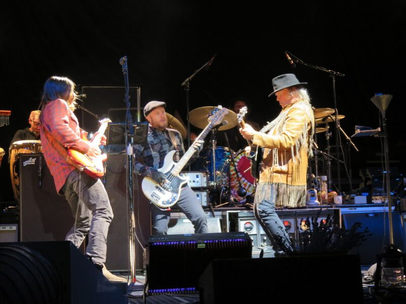 Neil lets Lukas Nelson play extra lead parts over the "top of the riff" and Neil encourages him and smiles. Micah resembles a mad scientist off to the right as he adds depth and beauty to the songs. His playing reminds me of Ben Keith in the part that he plays. The bass player is phenomenal, bouncing around, catching air. He loves his job and we love him in it. The drummer is on the beat, having fun, with the luckiest bongo player in the world doing what he does best. They have grown as a band and they have a certain powerful, gorgeous sound. It punches, it crunches. They are making great music. I'd say they are well ready for "Desert Trip" -the most expensive music festival ever featuring the fewest / biggest bands / artists ever down in the California Desert. I happily attended this smaller event and was over the moon with the results! I have seen maybe 250 or 300 shows and Neil Young consistently delivers the best of them all.