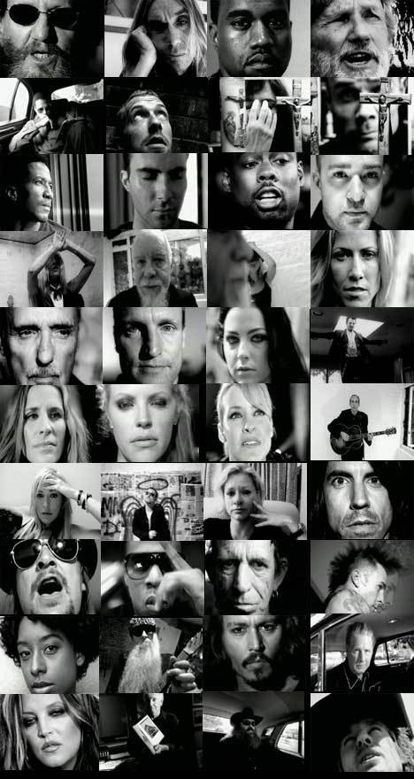 Artists include (in order): Rick Rubin, Iggy Pop, Kanye West, Chris Martin, Kris Kristofferson, Patti Smith, Terence Howard, Flea (Red Hot Chili Peppers), Q-Tip, Adam Levine (Maroon 5), Chris Rock, Justin Timberlake, Kate Moss, Sir Peter Blake (Sgt Peppers Artist), Sheryl Crow, Denis Hopper, Woody Harrelson, Amy Lee of Evanescence, Tommy Lee, Natalie Maines, Emily Robison, Martie Maguire (Dixie Chicks), Mick Jones, Sharon Stone, Bono, Shelby Lynne, Anthony Kiedis, Travis Barker, Lisa Marie Presley, Kid Rock, Jay Z, Keith Richards, Billy Gibbons, Corinne Bailey Rae, Johnny Depp, Graham Nash, Brian Wilson, Rick Rubin and Owen Wilson.